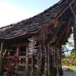 Papa Batu’s unusual roof is made of square-shaped pieces of stone with two holes cut on top, on the left and right, which are used for tying the tiles onto the frame of the roof using tough rattan. The top of the roof, where the stones laid on the right and left of the roof meet, is covered with bamboo to prevent rain falling into the building.